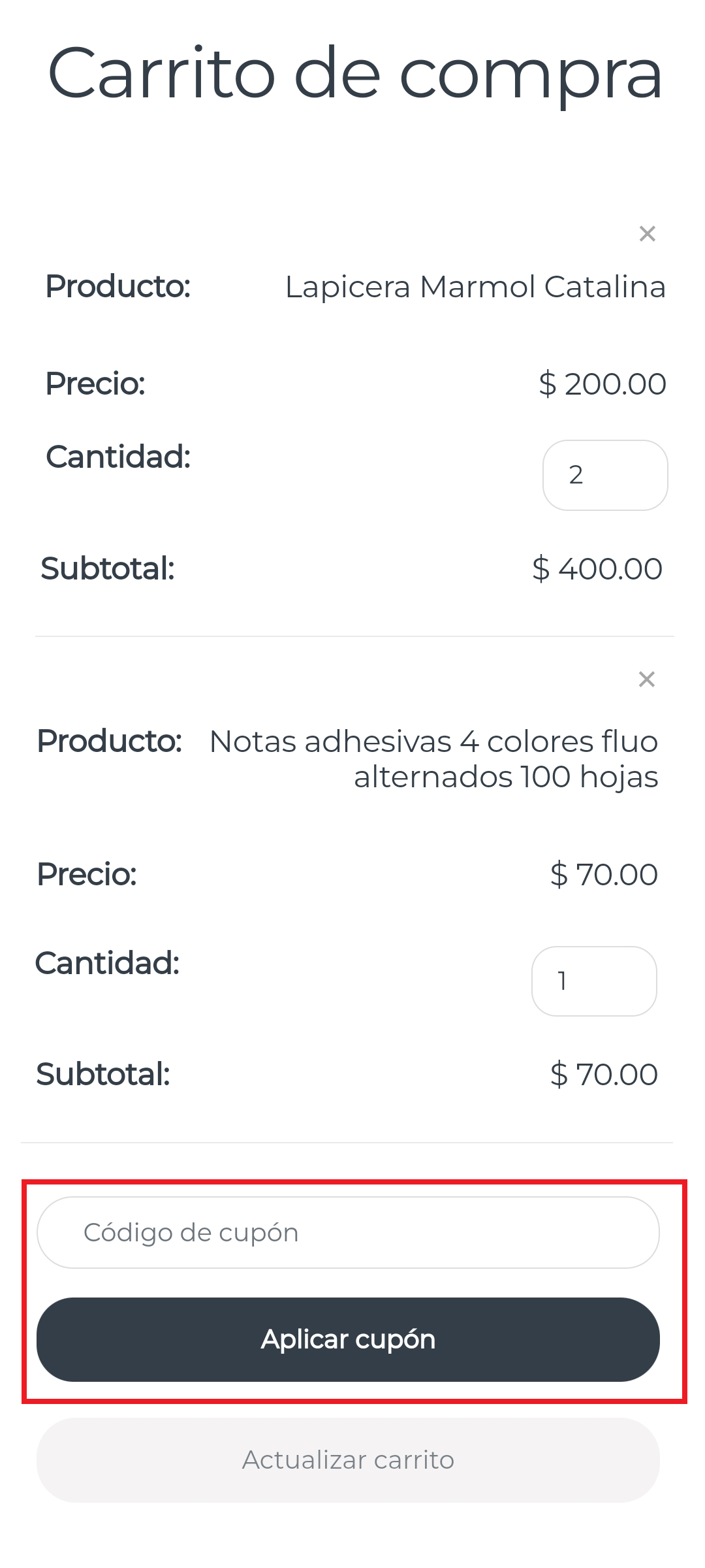 3. Copiás estos códigos y luego (en cada compra que realices) pegás el código dentro del Carrito, en el campo “Código de cupón” y presionas el botón “Aplicar cupón” para que se realice el descuento correspondiente.